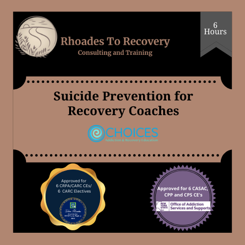 This training will provide Peer Recovery Professionals with an understanding of suicide as well as suicides' relationship to addiction and mental illness. Coaches will develop an understanding of the risk factors and warning signs and learn how to utilize their coaching skills to screen for and prevent suicide. Coaches will additionally learn about postvention strategies for taking care of themselves after working with someone who has suicidal thoughts/ideation, attempts or who dies by suicide.